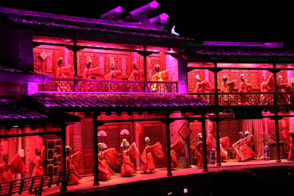 下梅古民居的建筑元素,使得演出現(xiàn)場(chǎng)更像是有著一千九百八十八個(gè)座位的巨型茶館。坐席的視覺半徑超過二公里,四面舞臺(tái)相連,可綿延出萬米長(zhǎng)卷的壯闊景象。置身其中,不僅可以將武夷山最著名的